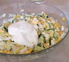 Добавляем кукурузу, измельченный укроп, майонез – перемешиваем.