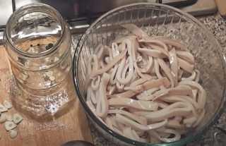 Кальмары достаём из банки и нарезаем соломкой. Порой купить качественного кальмара очень трудно, а вот приготовить их самим очень просто.
