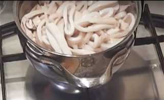 В кастрюлю наливаем 1 литр воды, доводим её до кипения, закладываем кальмаров, накрываем крышкой и варим 1 минуту, периодически помешиваем, затем снимаем кастрюлю с огня, сливаем воду, даём слегка остыть кальмарам и промываем их в теплой воде.