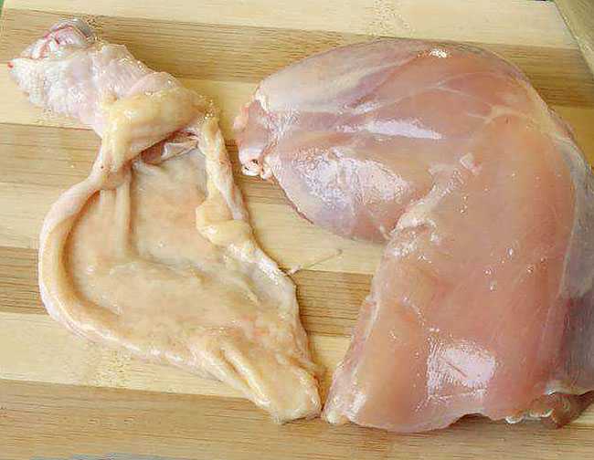 Филе курицы освобождаем от жира, пленки и кожи. Нарезаем мясо средними кусочкам, выкладываем в миску и заливаем холодным молоком. Ставим смесь в холодильник и даём ей настояться в течение 1 часа.