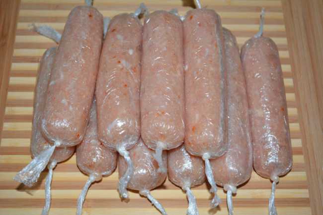 Теперь будем формировать колбаски. Для этих целей прекрасно подойдут свиные кишки, которые можно купить в мясном магазине, они продаются уже обработанными.