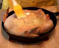 Прошло 20 минут, как наша курица запекалась в духовке. Достаем её и обмазываем размягченным сливочным маслом.