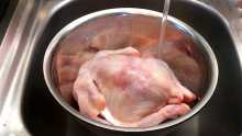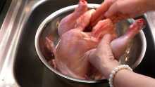 Тушку курицы выкладываем в миску, заливаем холодной водой и тщательно промываем как снаружи, так и изнутри.
