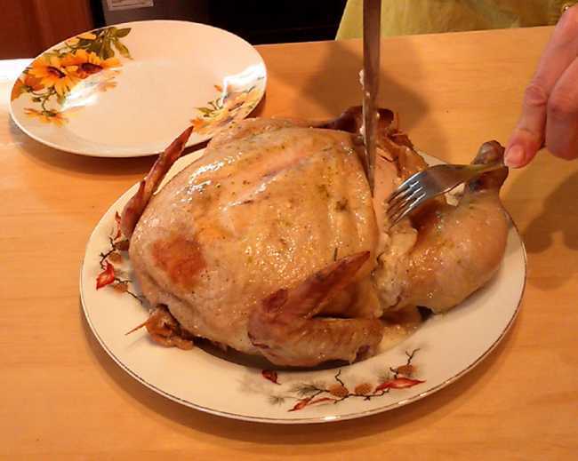 Как только время выпечки истечёт, выключаем духовку, но фаршированную курицу в духовке оставляем – пусть постоит ещё 10 -20 минут.