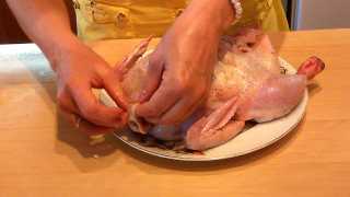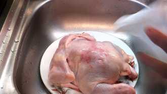 Подготовленную тушку продолжаем обрабатывать следующим образом. Стараемся аккуратно продевать палец под кожу и как можно большую площадь отделить кожи от мяса (от тушки, бедер и крыльев).