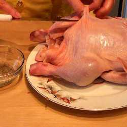Смесью из соли и перца смазываем курицу как снаружи, под кожей так и изнутри. Если данной нормы соли и перца не хватит, то можно её увеличить до необходимой.