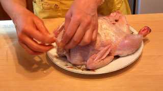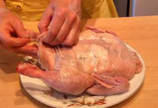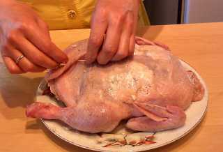 Затем тушку переворачиваем на брюшко и начиняем спину снизу и со стороны шеи, пропихивая начинку как можно дальше по всем направлениям.