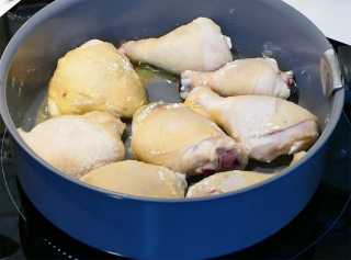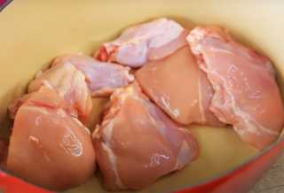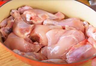 Куриные окорочка промываем водой, отделяем от них кожу, жир и разбираем на бедра и голени.