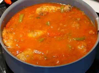 Обжаренную курицу заливаем соусом, добавляем лавровый лист, доводим до кипения, уменьшаем огонь до малого, накрываем сковороду крышкой, и тушим мясо 25 минут.