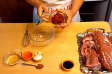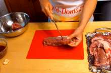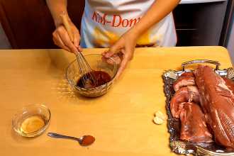 Мы заказываем у мясника чистую вырезку, т.е. без кости, удаляем с мяса излишки жира, пленку и жилы.