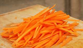 Затем очищаем их от кожуры и нарезаем на тонкие брусочки.
