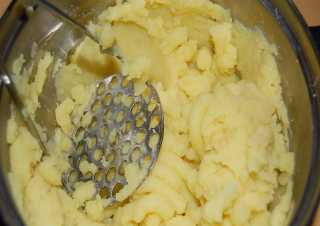 Картофель сварился, сливаем воду, переталкиваем, добавляем кусочек масла – переталкиваем, добавляем 10 ст. ложек теплого молока и ещё раз переталкиваем.