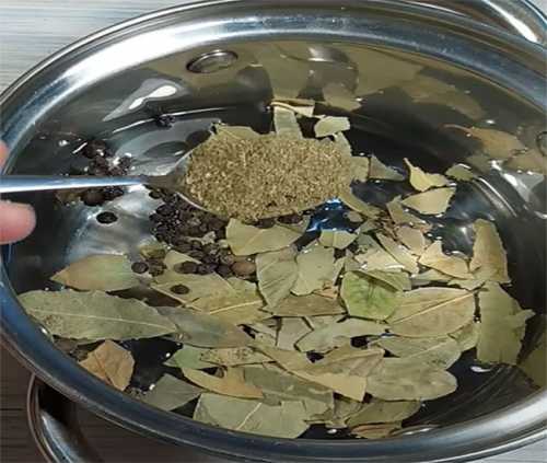 В кастрюлю наливаем воду, закладываем в неё: лавровый лист, чёрный перец горошком,