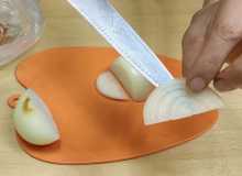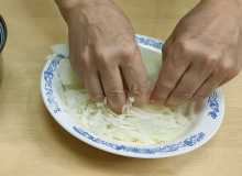 Репчатый лук очищаем от шелухи, промываем водой и шинкуем на очень тонкие полукольца.