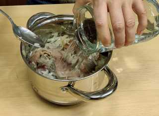 В банку с холодной водой выливаем 70% уксус, заливаем селедку, перемешиваем, и пробуем рассол, если он не солёный, то его можно слегка подсолить, содержимое кастрюли перемешиваем.