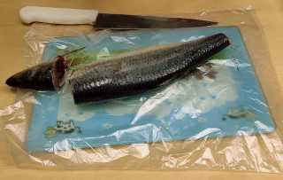 Селёдку лучше брать пряного посола и с толстой спинкой, т.е. жирную. Её разбираем на филе, но прежде удаляем голову, хвост, разрезаем брюшко и вынимаем внутренности.