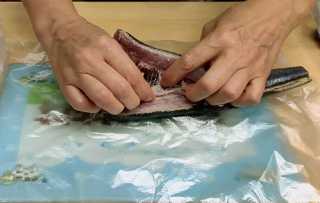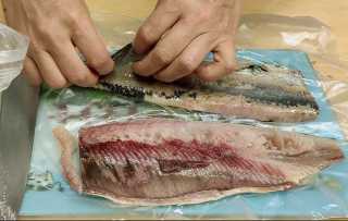 Разбираем тушку на филе, вынимаем все кости и снимаем кожу.