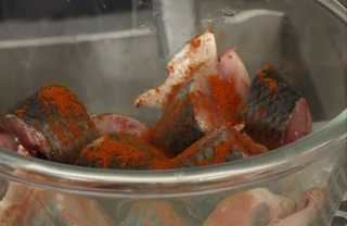 У рыбы удаляем: голову, внутренности, хвост, промываем её водой и нарезаем на кусочки в 2-3 см.