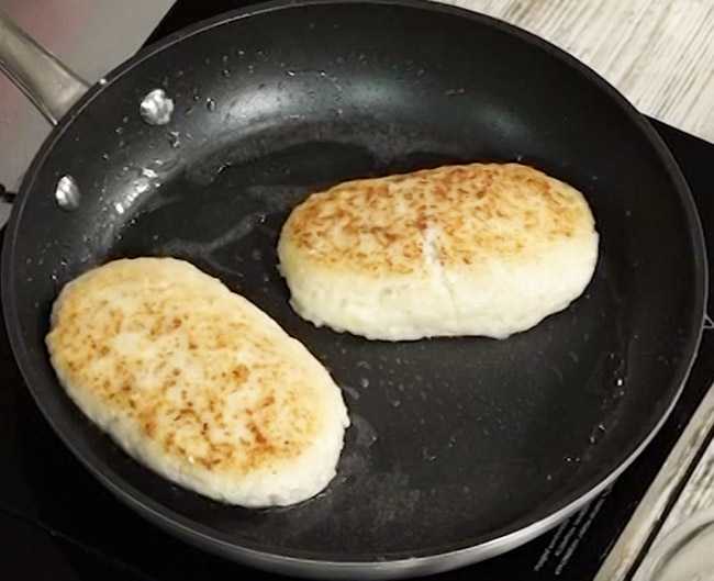 Из готового фарша формируем две большие, продолговатые котлеты, отбиваем каждую из руки в руку по 25 раз. Обваливаем в муке и обжариваем на разогретом масле примерно по 5 минут с каждой стороны, до золотистой корочки, при среднем огне.