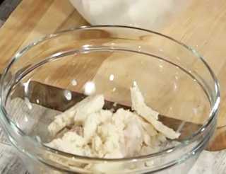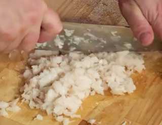 Филе трески, освобожденное от костей, измельчаем при помощи ножа в очень мелкую субстанцию.