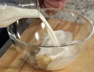 Хлеб, без корочки, заливаем молоком и даём ему пропитаться в течение 20 минут, при этом каждые 5 минут его переворачивать с одного бака на другой.