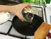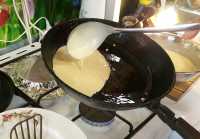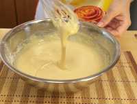 Подсолнечное масло выливаем в сковороду, нагреваем его до лёгкого дымка и порциями выливаем в тесто, при этом его нужно очень быстро перемешивать.