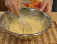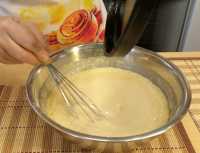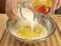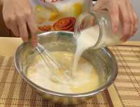 Добавляем куриные яйца, которые предварительно нужно помыть водой, слегка перемешиваем, добавляем порциями 1 стакан молока и тщательно перемешиваем.