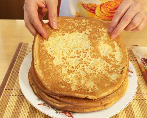 Нижняя часть блина поджарилась, переворачиваем его и ждём, когда он испечётся. Выкладываем его на блюдо, смазываем растопленным сливочным масло и продолжаем печь все блины. Перед каждой заливкой тесто нужно перемешивать по дну, чтобы мука не оседала на дно миски. Жарим блины на высоком огне.