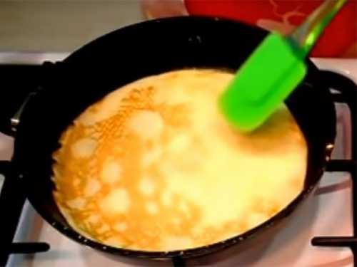 Как только блин подрумяниться снизу, при помощи лопатки переворачиваем его на другую сторону и жарим до легкой корочки.
