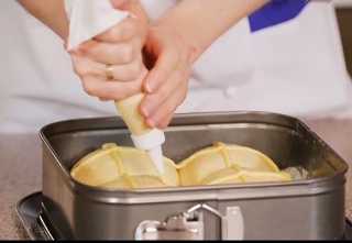 Перед выпечкой на булочки наносим крем в виде сеточки, при помощи кондитерского мешка или целлофанового пакета.