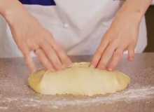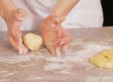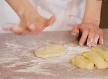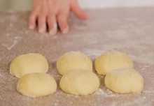 Каждый кусочек скатываем в булочку, для этого с начало придаём ей форму лепешки, затем края лепешки складываем в центр, защипываем их и катаем шарик – с мукой лучше не перебарщивать, можно руки смочить водой или растительным маслом.