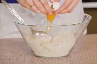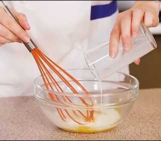 Затем добавляем: воду, 2 яйца и снова перемешиваем.