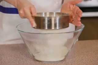 В миску просеиваем муку, лучше взять муку высшего сорта, добавляем сухое молоко, оно позволит тесту приобрести более светлый вид и пышность.