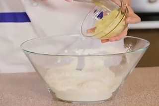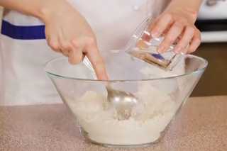 Добавляем к сухим ингредиентам: соль, дрожжи – массу перемешиваем.