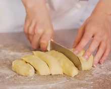 Тесто обмяли, формируем колбаску и делим её на 6 равных частей.