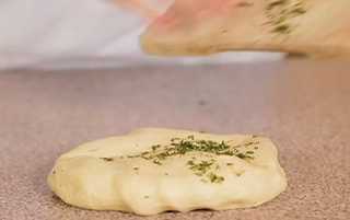 Тесто подошло, слегка его придавим, равномерно распределим измельчённый тимьян и хорошо вмешаем.