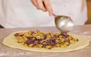 На нижний пласт выкладываем начинку и равномерно распределяем её по поверхности, не доходя до краёв на 2 см.