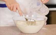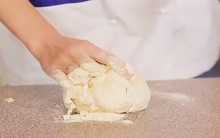 В смесь добавляем воду и всё перемешиваем. Затем тесто переносим на стол и начинаем его вымешивать до однородного, упругого состояния.