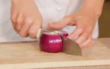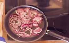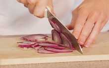 Красный репчатый лук, очищаем от шелухи, промываем водой и нарезаем тонкими полукольцами.