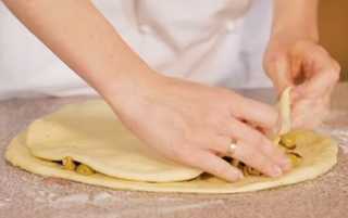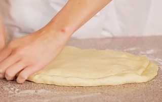 Каждый кусочек обминаем, и раскатываем в тонкий пласт, при этом большая часть будет снизу.