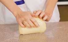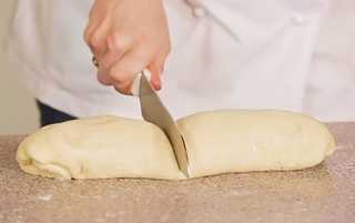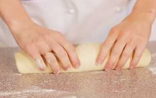 Тесто подошло, выкладываем его на стол, который слегка припылим мукой, разравниваем в лепёшку, выпуская пузырьки, скатываем в рулетик и делим на две части. Один кусок, должен быть немного больше другого.
