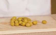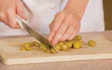 Оливки, без косточек, нарезаем тоненькими колечками и перекладываем их в миску к луку.