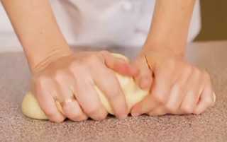 Подсолнечное масло наливаем в руку, на стол и вбиваем его в тесто. Подготовленное тесто убираем в миску, накрываем плёнкой и оставляем в теплом месте на 30 минут – пусть подойдёт.