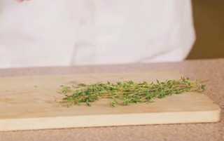 Листики тимьяна отделяем от стебельков и очень мелко их измельчаем.