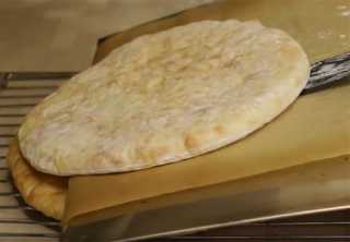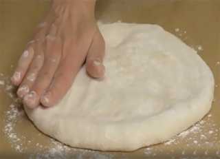 Затем противень застилаем бумагой для выпечки, посыпаем мукой, выкладываем на него лепёшечку, которую нужно перевернуть швом вниз, и продолжаем формировать тонкую лепёшку.