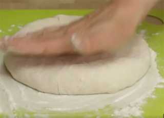 Досточку присыпаем мукой, выкладываем на неё мешочек с начинкой, и начинаем от центра превращать мешочек в лепёшку, но только лепёшку формируем наполовину.