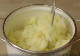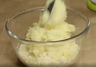 Картофель отвариваем в слегка подсолённой воде, до готовности, переталкиваем в пюре и даём слегка остыть.