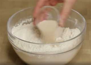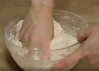 В глубокую миску просеиваем муку, добавляем соль и перемешиваем. В муке делаем углубление, выливаем молоко с дрожжами – перемешиваем, тесто будет липнуть к рукам, но руки можно смочить водой. В конце замеса добавляем растительное масло и вымешиваем тесто до полного впитывания масла.