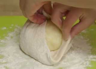 Из куска теста формируем лепёшку, на которую укладываем шарик из начинки, края теста собираем поверх начинки, как бы формируем мешочек, и плотно их скрепляем.