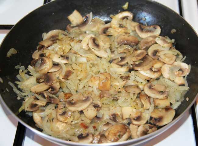 К обжаренному луку добавляем грибы, которые нарезаем средними ломтиками, и жарим всё вместе 10-15 минут на среднем огне. Обжаренную начинку нужно остудить до теплого состояния.